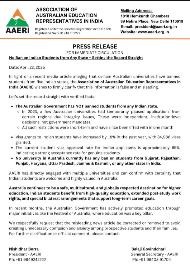 AAERI urges media outlets and concerned individuals to correct or retract misleading statements to avoid creating unnecessary confusion and anxiety among prospective students and their families. The relationship between India and Australia in the field of education remains strong, and Indian students continue to be an integral part of Australia’s vibrant academics.